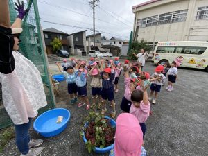 手を泥だらけにしながら、芋掘りを頑張った子どもたち。