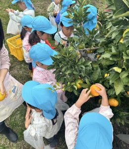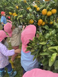数を数えながら採ったり、美味しそうな色のみかんを吟味して採ったり、楽しんでいました。もぎたてみかんを食べ、とてもいい顔をしていた子ども達でした!