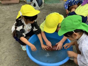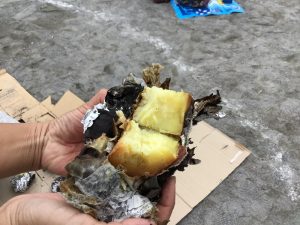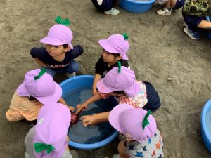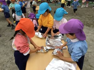 自分達で、さつまいもを洗って、焼き芋にするために新聞紙やアルミホイルに包みました。そして、「おいしくな〜れ!」と、焚き火の中へ投げ入れました。