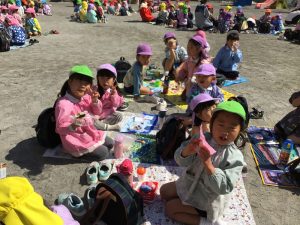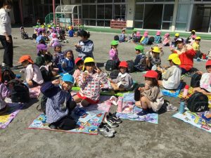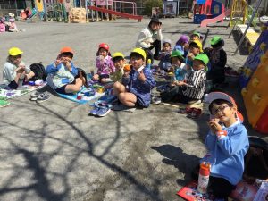 朝からかばんに入っているおにぎりとレジャーシートを見て楽しみにしていた子ども達。今日は青空の下、園庭でみんなで食事をし、賑やかなランチタイムとなりました![]()