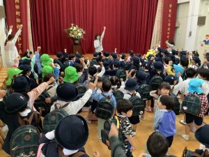 始業式では、先生たちと一緒にえいえいおーをしました!